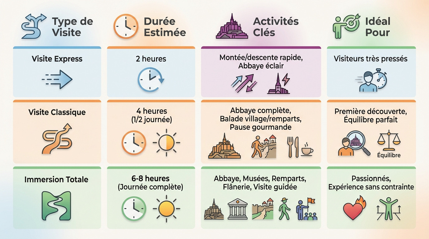 Vous avez saisi les grands formats, mais concrètement, combien de temps pour visiter le mont saint michel étape par étape ? C’est en additionnant ces durées que vous construirez votre propre programme.